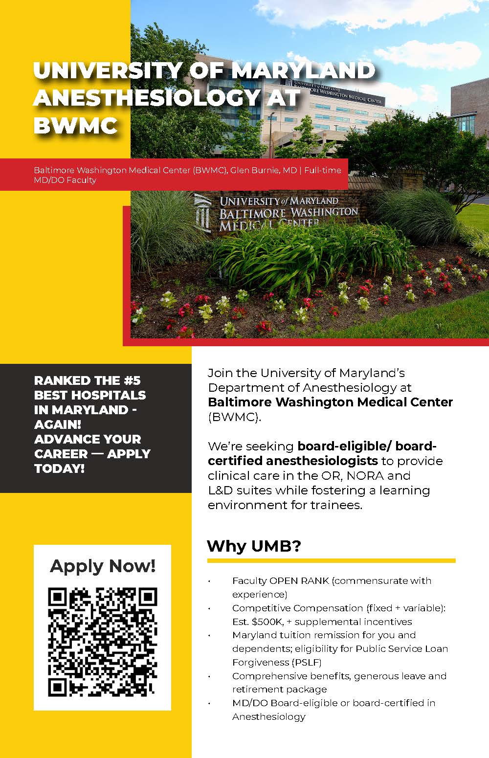 The University of Maryland Department of Anesthesiology is growing. We are seeking board-eligible/board-certified Anesthesiologists of all academic ranks who possess a strong commitment to academic anesthesiology, in addition to Assistant Professors/Research Associates to contribute to our rapidly expanding research enterprise.