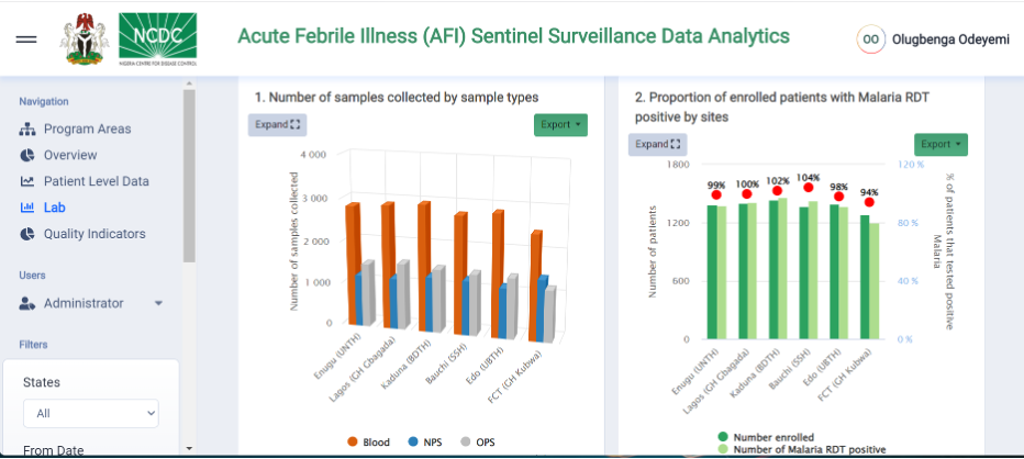 The Data Analytics Visualization Tool (DAVT) was developed as part of the secureNigeria health surveillance project, a USCDC funded initiative by the University of Maryland, Baltimore (UMB) and the Institute of Human Virology Nigeria (IHVN). The analytical dashboard was designed to support surveillance and response at the National Centre for Disease Control (NCDC) and State Public Health Emergency Operation Centres (PHEOCs).