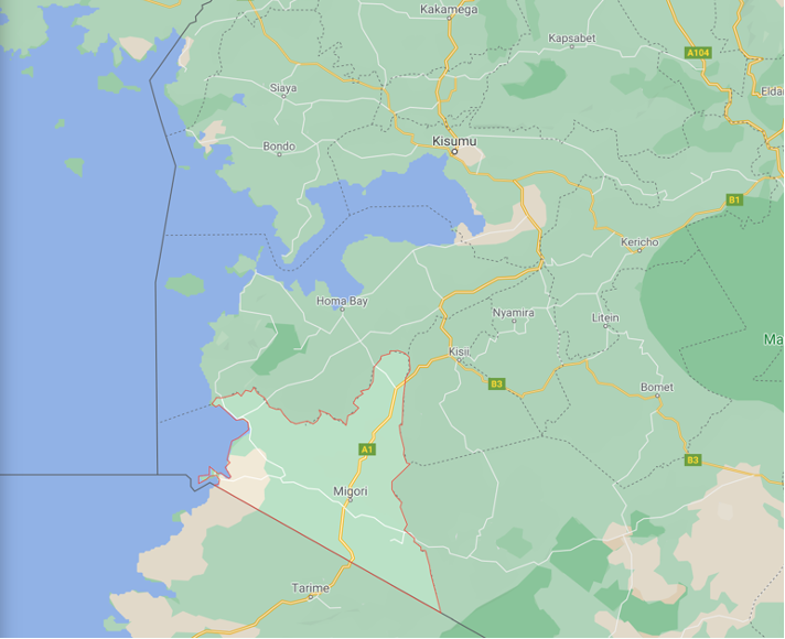 Map showing Migori County in Western Kenya, with neighboring Homa Bay, Siaya, and Kisumu Counties.