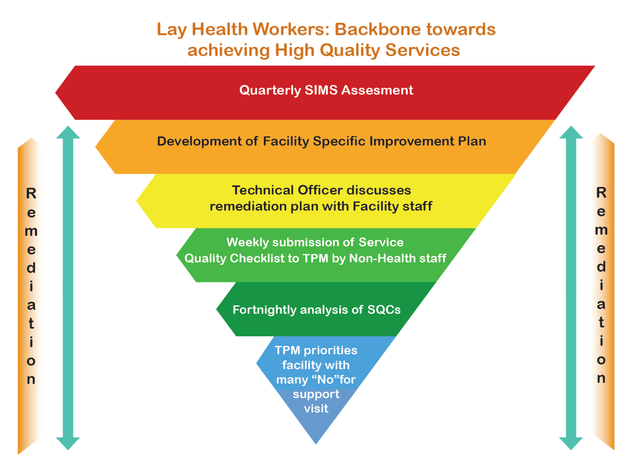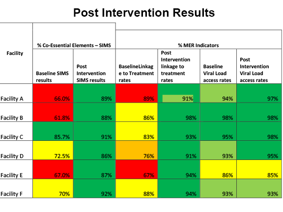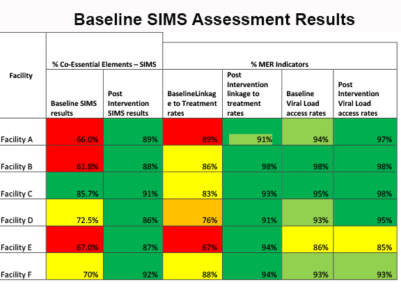 Lessons Learned: SIMS post remediation results revealed 100% of facilities had CEE scores above 80% and 100% of facilities achieving over 90% of key epidemic control targets. Due to these results, a service quality checklist comprised of key CEEs that assess implementation of standard operational plans, guidelines, and policies in HIV management was developed for lay health workers to monitor facilities and submit weekly reports to the technical program manager.