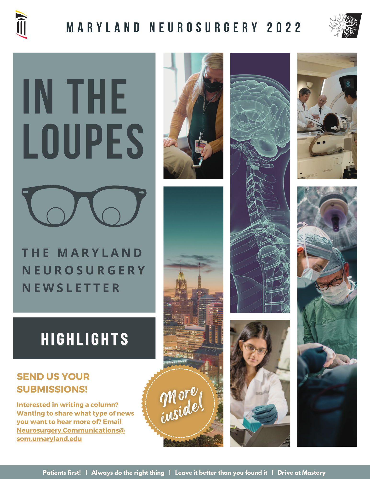 In The Loupes is a monthly newsletter intended to share news within the department and strengthen its culture, as well as highlight exciting and notable achievements, publications, honors, and awards of Maryland Neurosurgery. Written and distributed by Media & Events Specialist, Rachel McGowan (rcmcgowan@som.umaryland.edu).