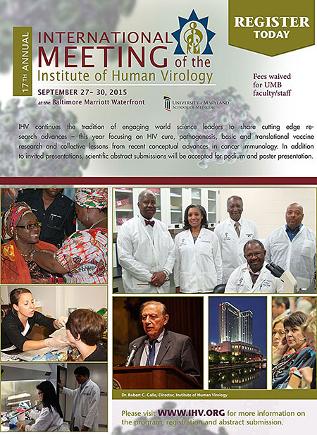 The Institute of Human Virology (IHV) at the University of Maryland School of Medicine is hosting IHV’s 17th Annual International Meeting Sunday, September 27 through Wednesday, September 30 at the Baltimore Marriott Waterfront Hotel in Baltimore, Maryland.